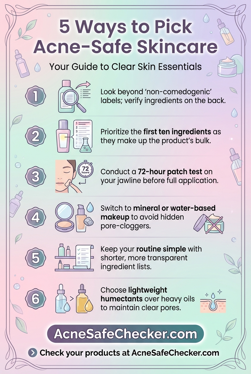 As a general rule, look for "oil-free" and "non-comedogenic" labels, but verify them by ensuring the first five to ten ingredients—the bulk of the product—are low on the comedogenic scale.