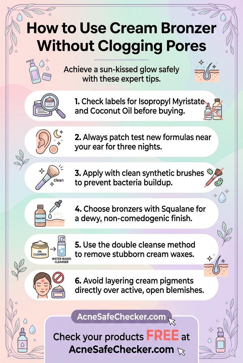 Before applying a new cream bronzer to your entire face, test it on a small area near your ear for three consecutive nights. If no bumps appear, it is likely safe for your specific skin chemistry.