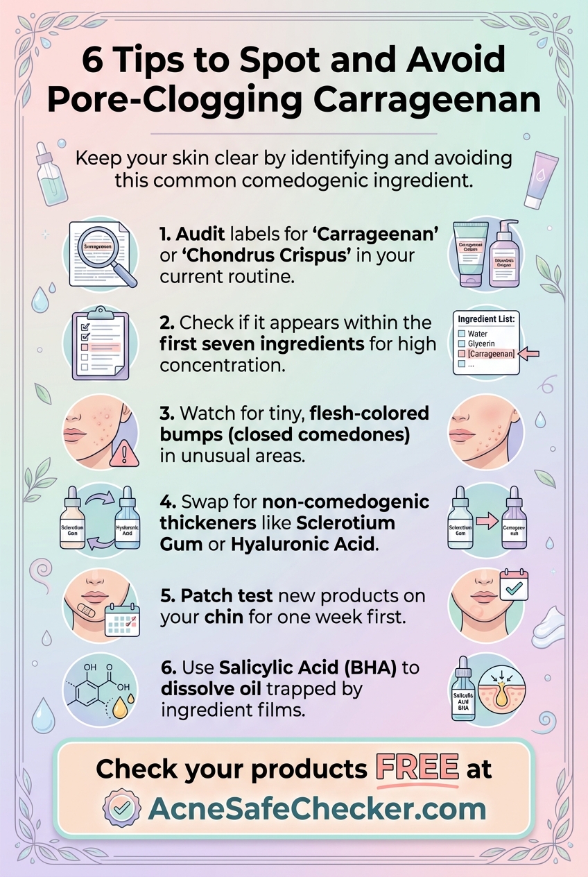 If you have been using a product with carrageenan and your pores feel congested, look for a cleanser or toner containing Salicylic Acid (BHA). This oil-soluble acid can penetrate deep into the pores to dissolve the