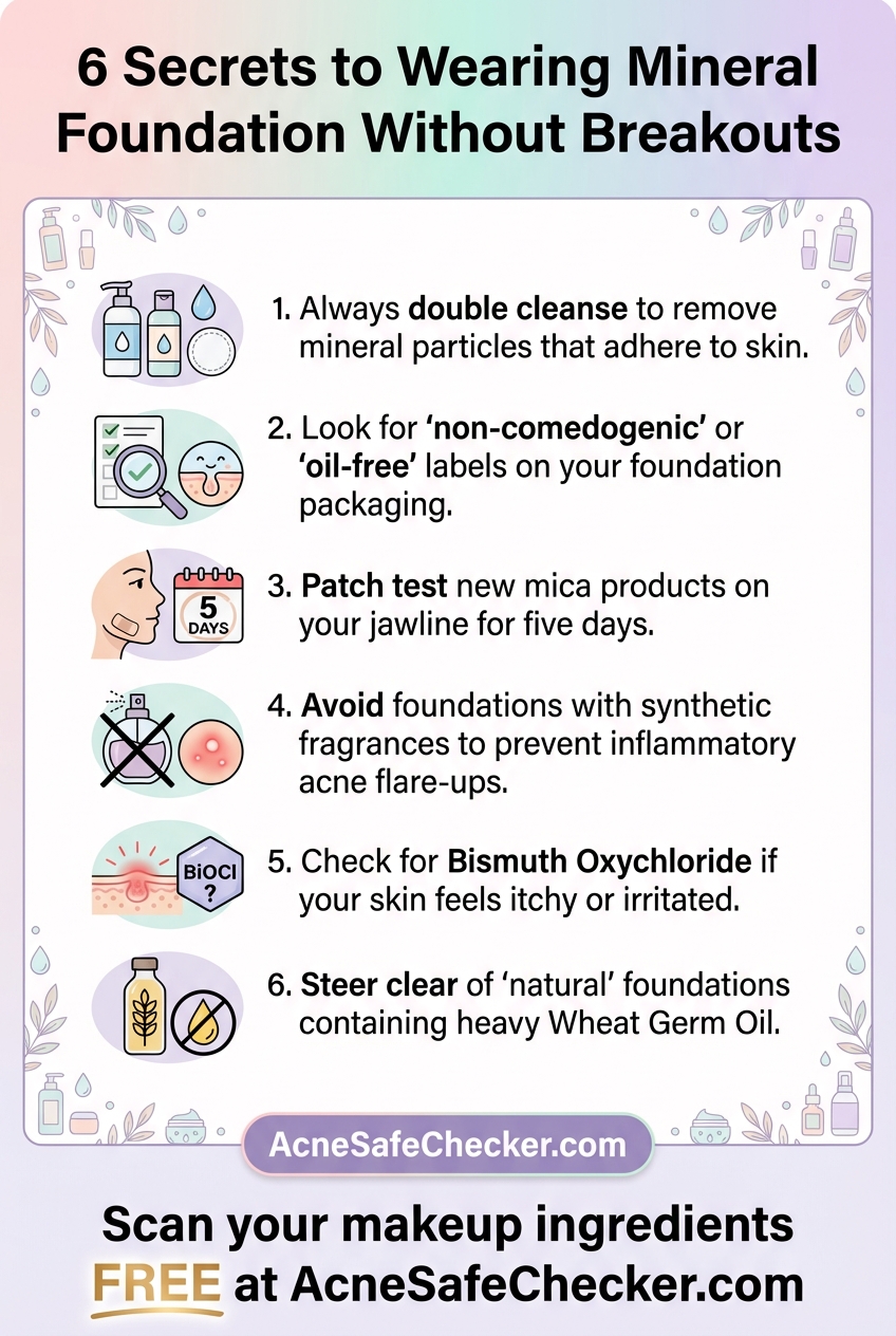 Mica is rarely the only ingredient in a foundation. Many liquid and cream foundations use mica alongside high-comedogenic ingredients like isopropyl myristate, certain coconut derivatives, or heavy silicones. When a breakout occurs, the mica is visible (due to the shimmer), making it an easy target for blame, while the true pore-clogging culprits remain hidden in the fine print.