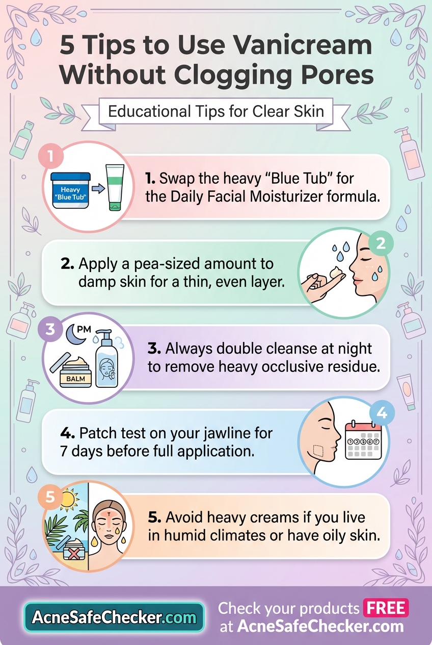 - Choose the Lighter Formula: If you have acne-prone skin, skip the thick cream in the tub and opt for the Vanicream Daily Facial Moisturizer or the Vanicream Lite Lotion. These have a lower concentration of occlusives.