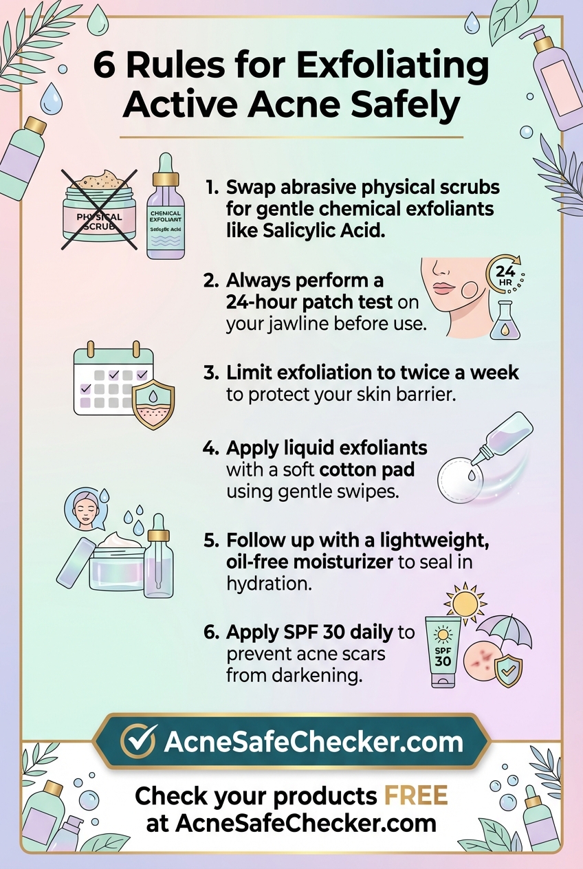 Instead of mechanical friction, dermatologists recommend chemical exfoliation for active acne. Chemical exfoliants use specific acids or enzymes to weaken the 'glue' (desmosomes) that holds dead skin cells together, allowing them to shed naturally without trauma.