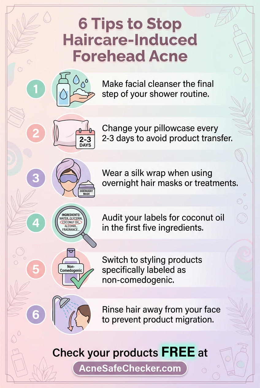 While coconut oil is a miracle worker for dry cuticles and hair shafts, it is a nightmare for acne-prone skin. It contains high levels of lauric acid, which is notorious for being highly comedogenic. If your shampoo or "curl cream" lists Cocos Nucifera (Coconut) Oil in the first five ingredients, it is likely contributing to your forehead breakouts.