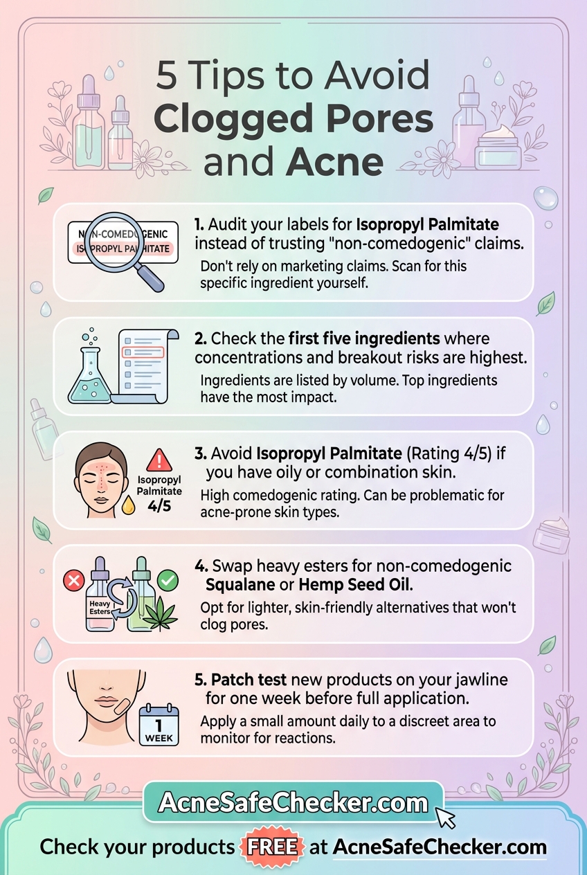 Ingredients are listed in order of concentration. If Isopropyl Palmitate is in the first five ingredients, its concentration is high, and its pore-clogging potential is at its peak. If it is at the very end of the list, the risk is lower, though still present for highly sensitive individuals.