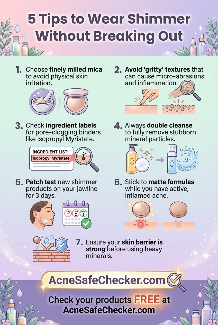 Before purchasing, run the ingredient list through a comedogenic checker. Look for the presence of isopropyl myristate, laureth-4, or cocoa butter. If these are near the top of the list alongside mica, the product is likely to clog your pores.