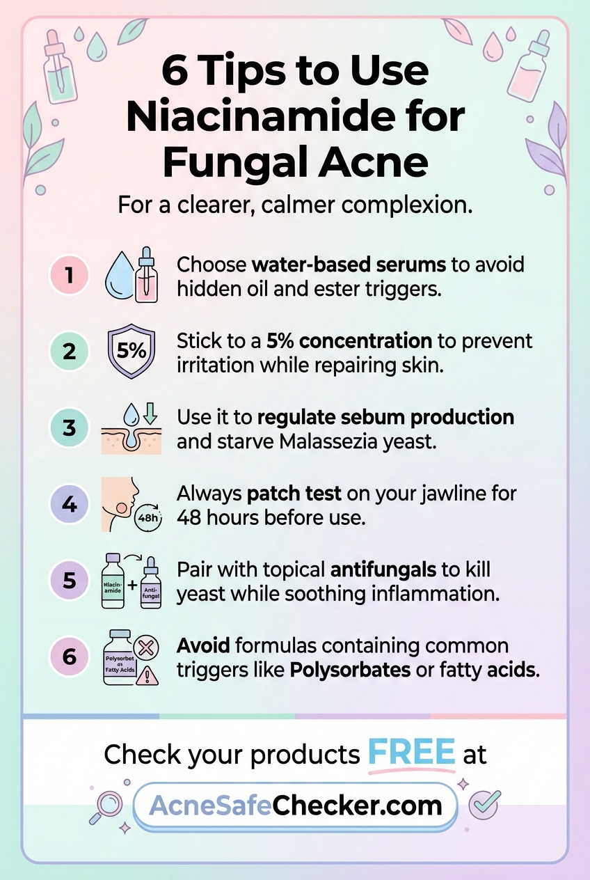 To successfully integrate niacinamide into a fungal acne-safe routine, follow these steps: