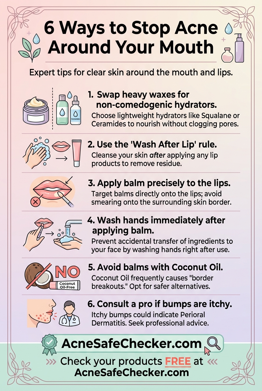 Not every bump around the mouth is acne. If you see small, red, itchy bumps that don't quite look like whiteheads, you might be dealing with Perioral Dermatitis. This condition is often aggravated by heavy petrolatum and flavored lip balms (like cinnamon or peppermint). If your "acne" isn't responding to traditional treatments, consult a professional.