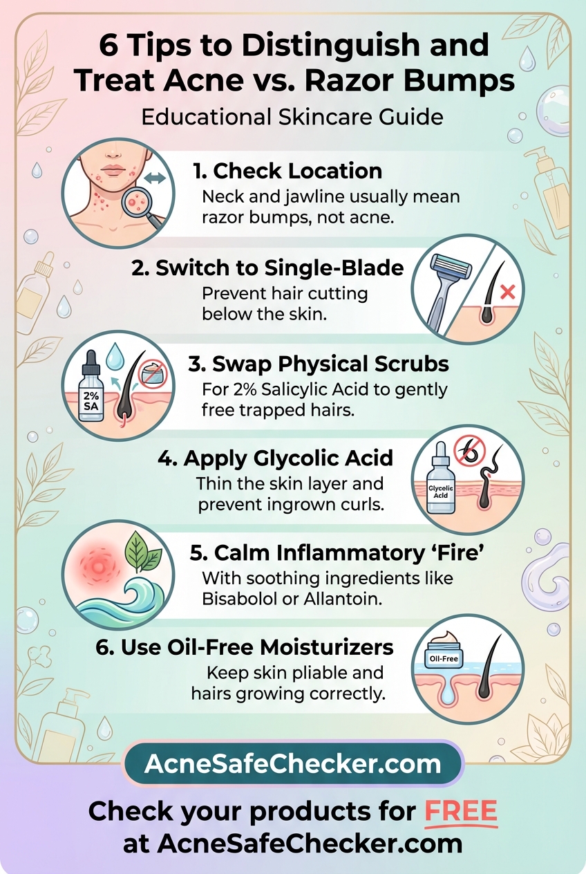 - Identify the Location: If the bumps are strictly where you shave (neck, jawline, bikini area), they are likely razor bumps. If they appear on the forehead, nose, or back, it is likely acne.