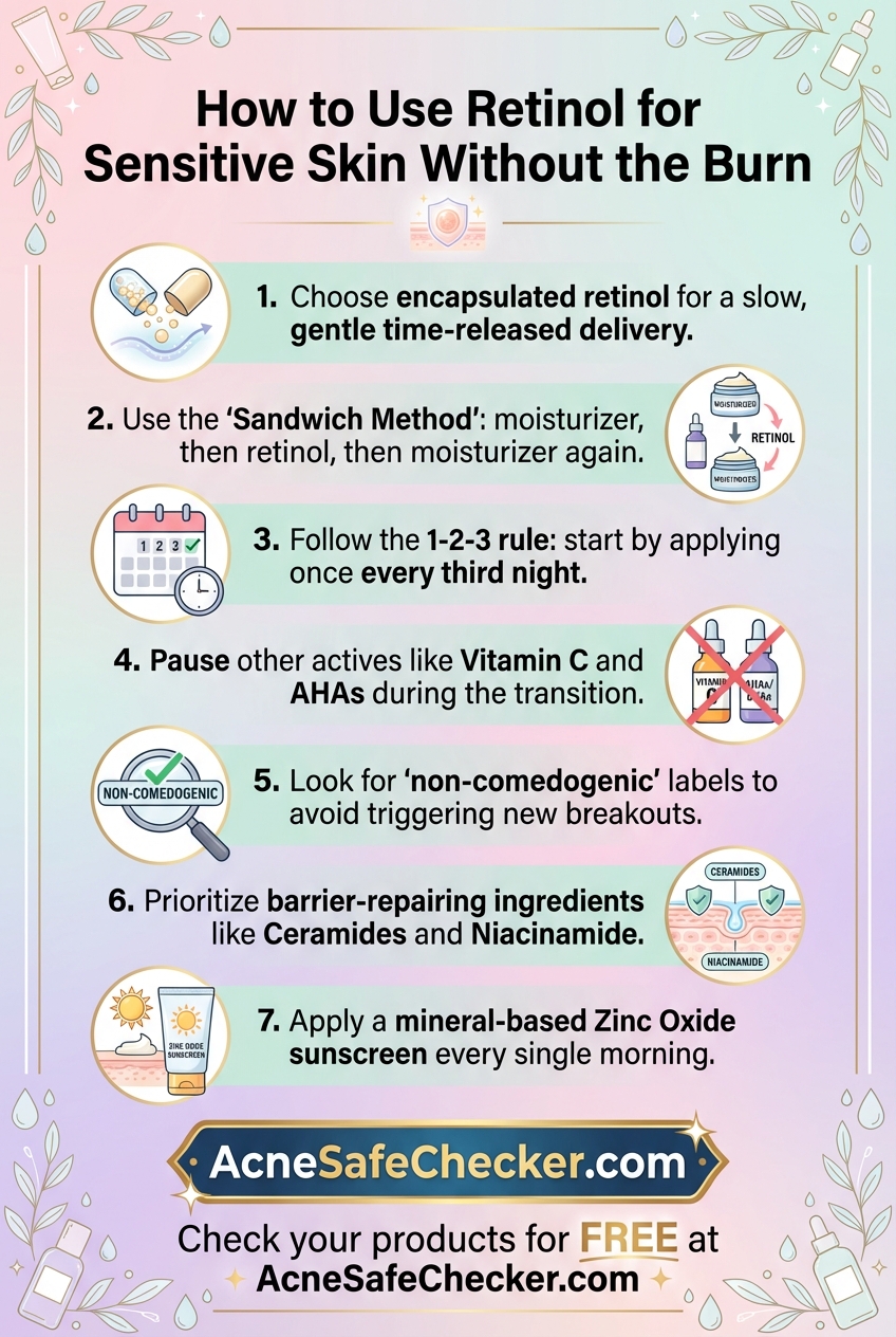 This is the ultimate hack for sensitive skin. After cleansing, apply a thin layer of a fragrance-free, ceramide-rich moisturizer. Wait five minutes, apply a pea-sized amount of retinol, and then apply another layer of moisturizer on top. This "sandwiches" the active ingredient, slowing its absorption and providing a buffer for your skin barrier.