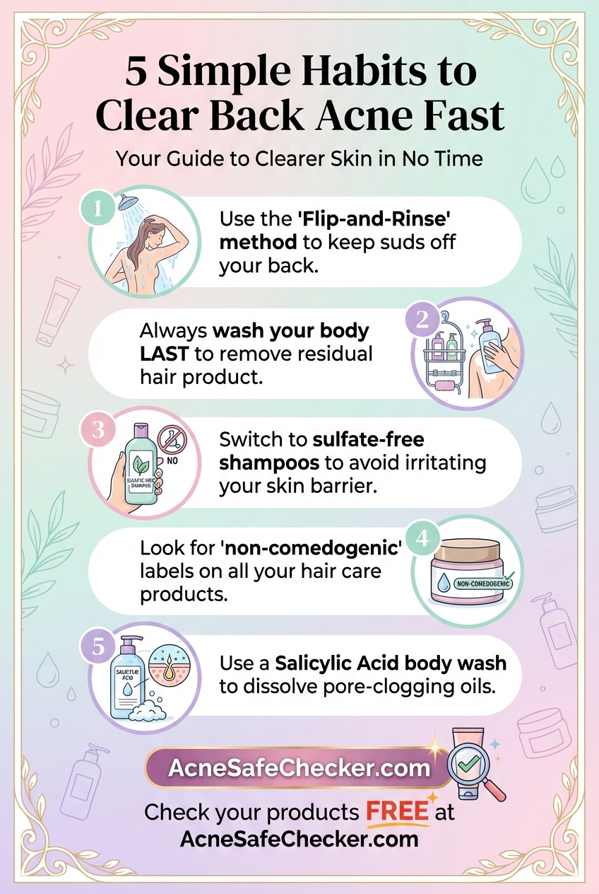 Check Ingredients NowThis phenomenon is known as acne cosmetica, a form of acne caused by the topical application of cosmetic products. When you rinse shampoo or conditioner out of your hair, the suds travel down your back, often leaving behind a film of pore-clogging ingredients. If you are prone to breakouts, understanding which ingredients to avoid is the first step toward a clear back.