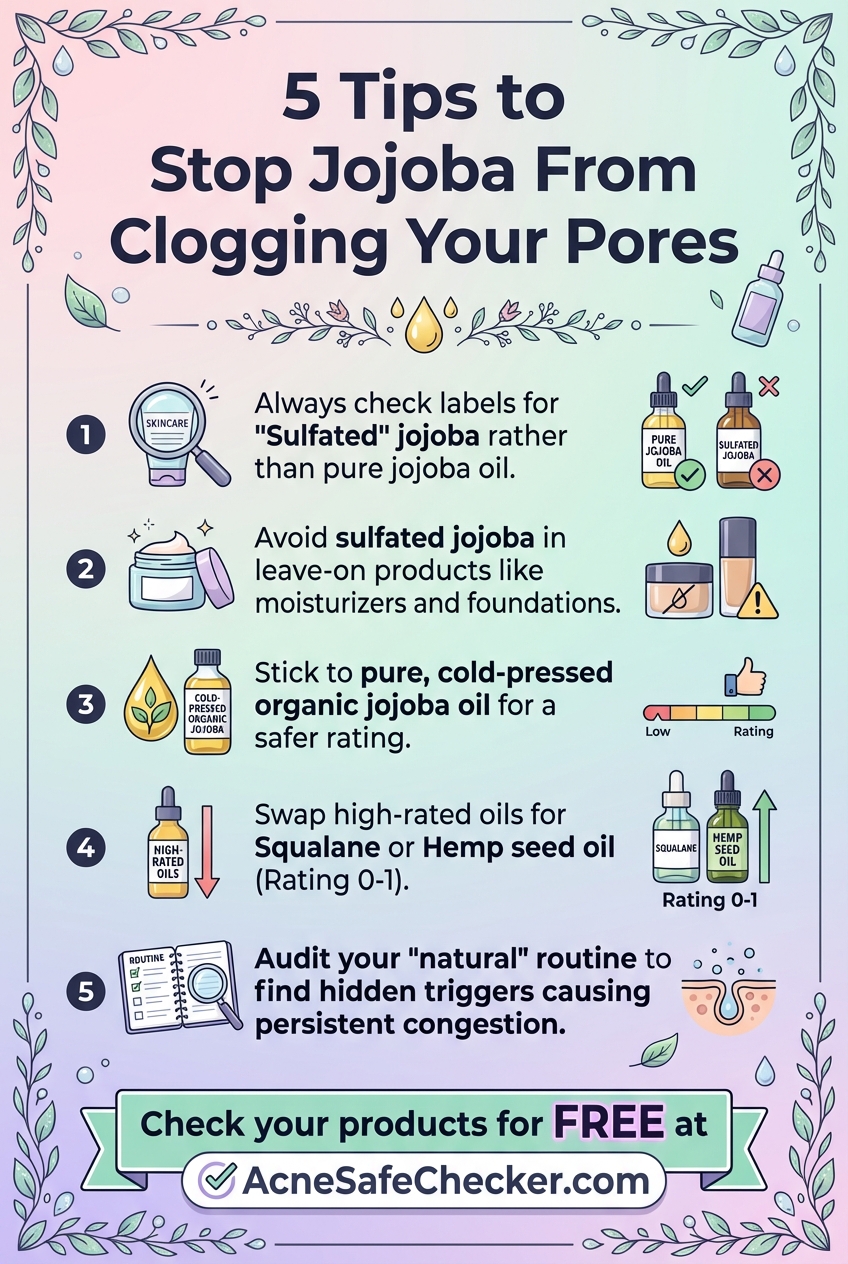 Check your current products. If you find sulfated jojoba oil in a product you leave on your skin all day (like a moisturizer or foundation), consider swapping it out for a truly non-comedogenic alternative.